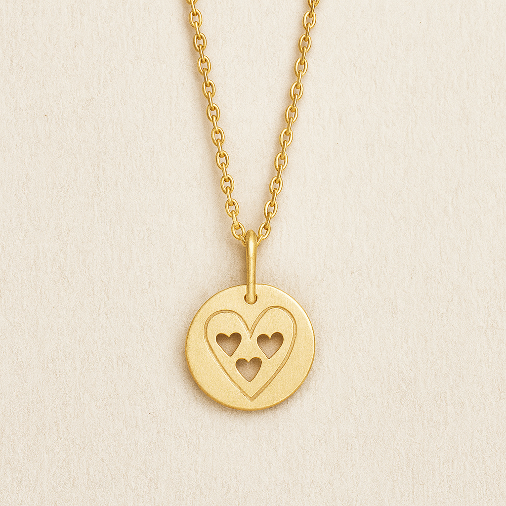 Vedhæng med motiv af tre udskårne hjerter i 14 karat forgyldt sterlingsølv fra Frk. Lisberg. Vedhænget kan sættes på både halskæder og armbånd alt efter ønske. Vedhænget kan let kombineres med andre af Frk. Lisberg’s mange message vedhæng, hvis man ønsker det, men er også rigtig fin at bære alene.