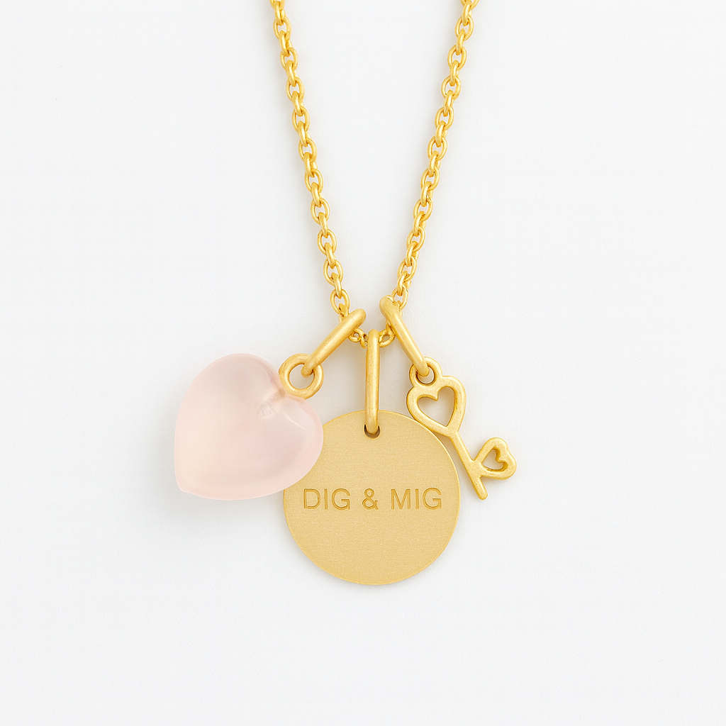 Det fine Ædelsten hjerte-vedhæng med en diameter på 1,1 cm tilfører smykket en blød og romantisk dimension. Hjertet repræsenterer kærlighed, følelser og sårbarhed – det, vi bærer inderst inde. Sammen med Hjerte nøgle-vedhænget, som måler ca. 9 mm, fuldendes fortællingen: en nøgle til hjertet, et symbol på tillid, åbenhed og den person, der har adgang til det, der betyder mest 🔑