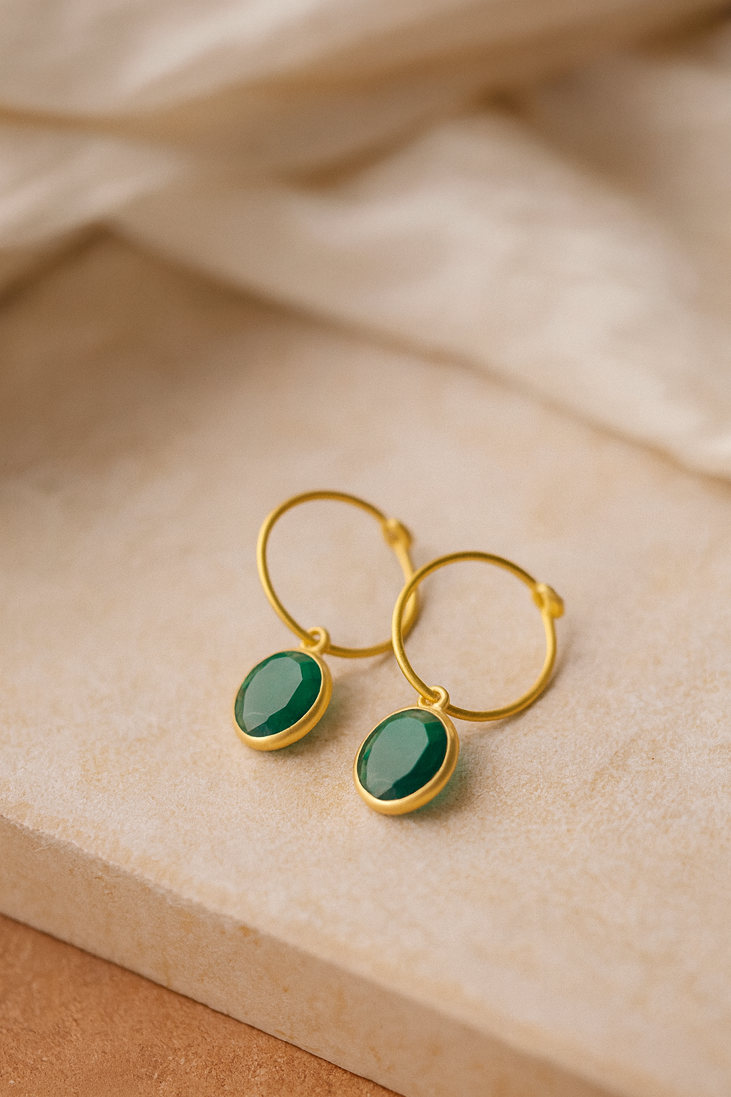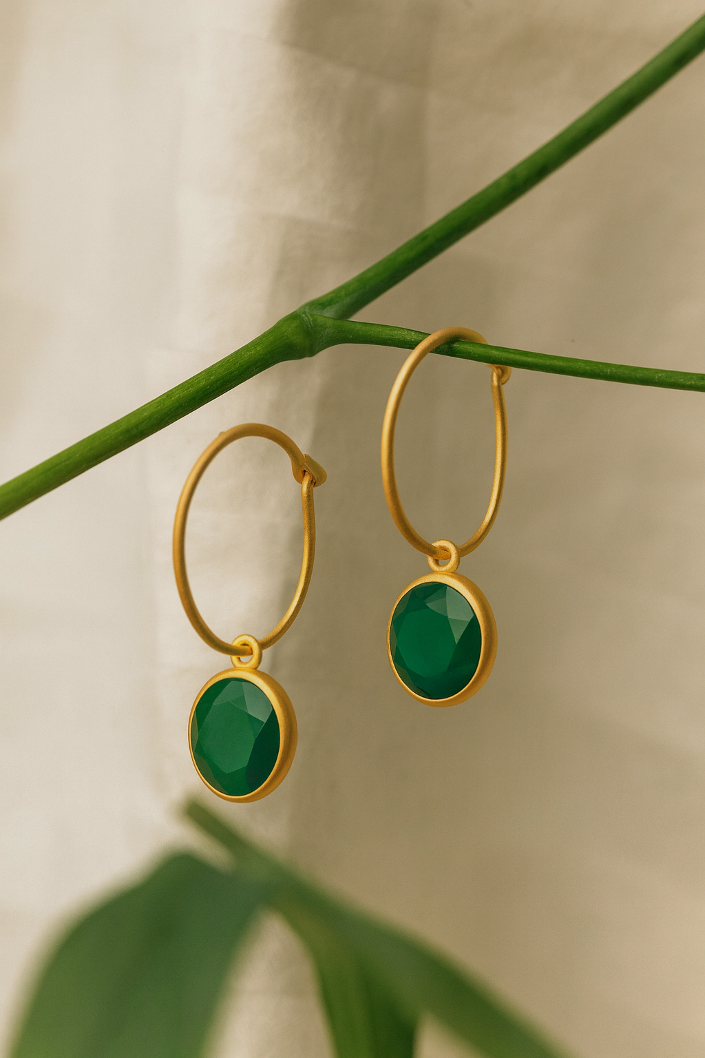 Adeline creol grøn onyx er et smykke i 14 karat forgyldt sterlingsølv. Adeline creolerne laves også i sterlingsølv eller hvis du ønsker en anden farve kan du vælge imellem fx. lavendel eller grøn.