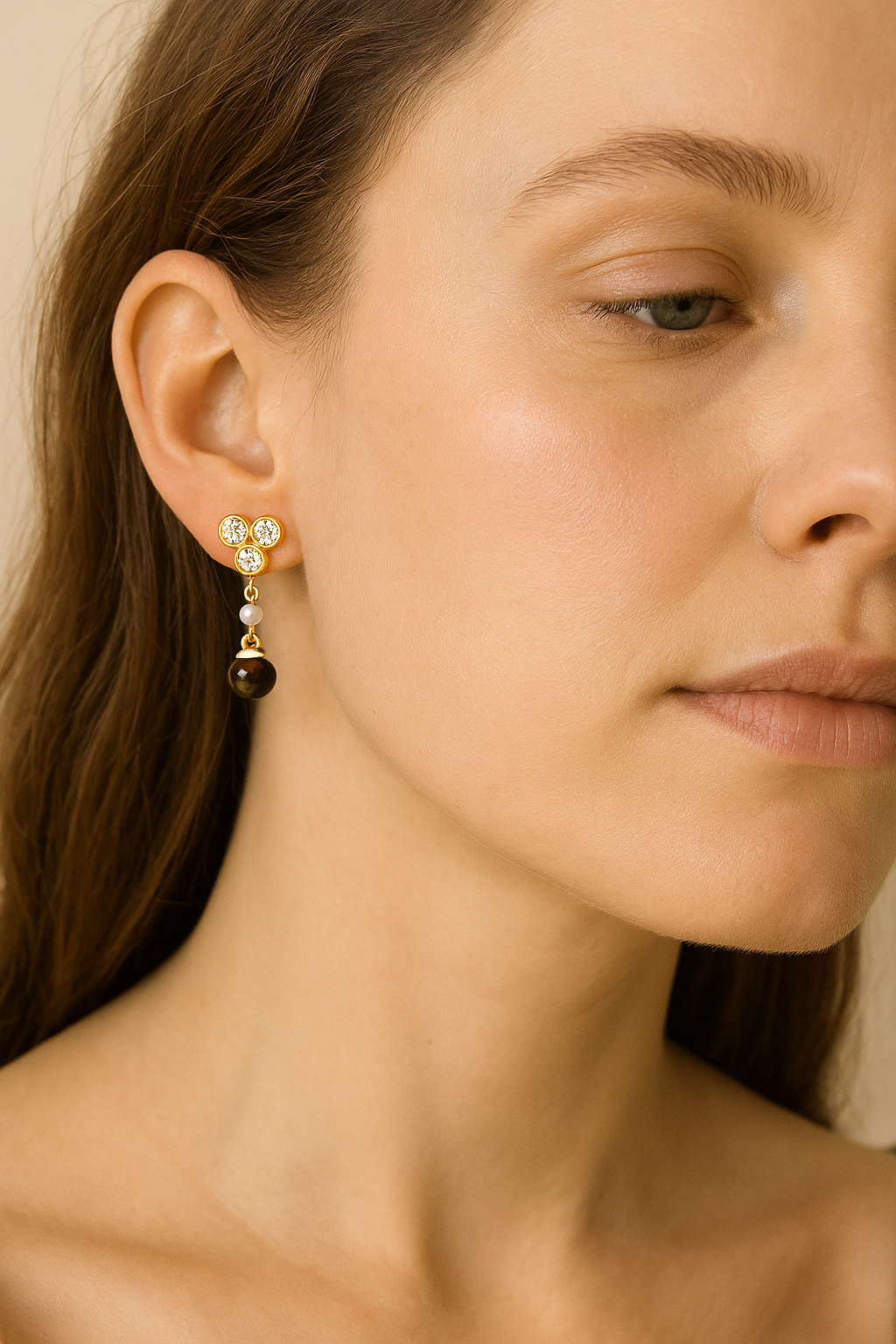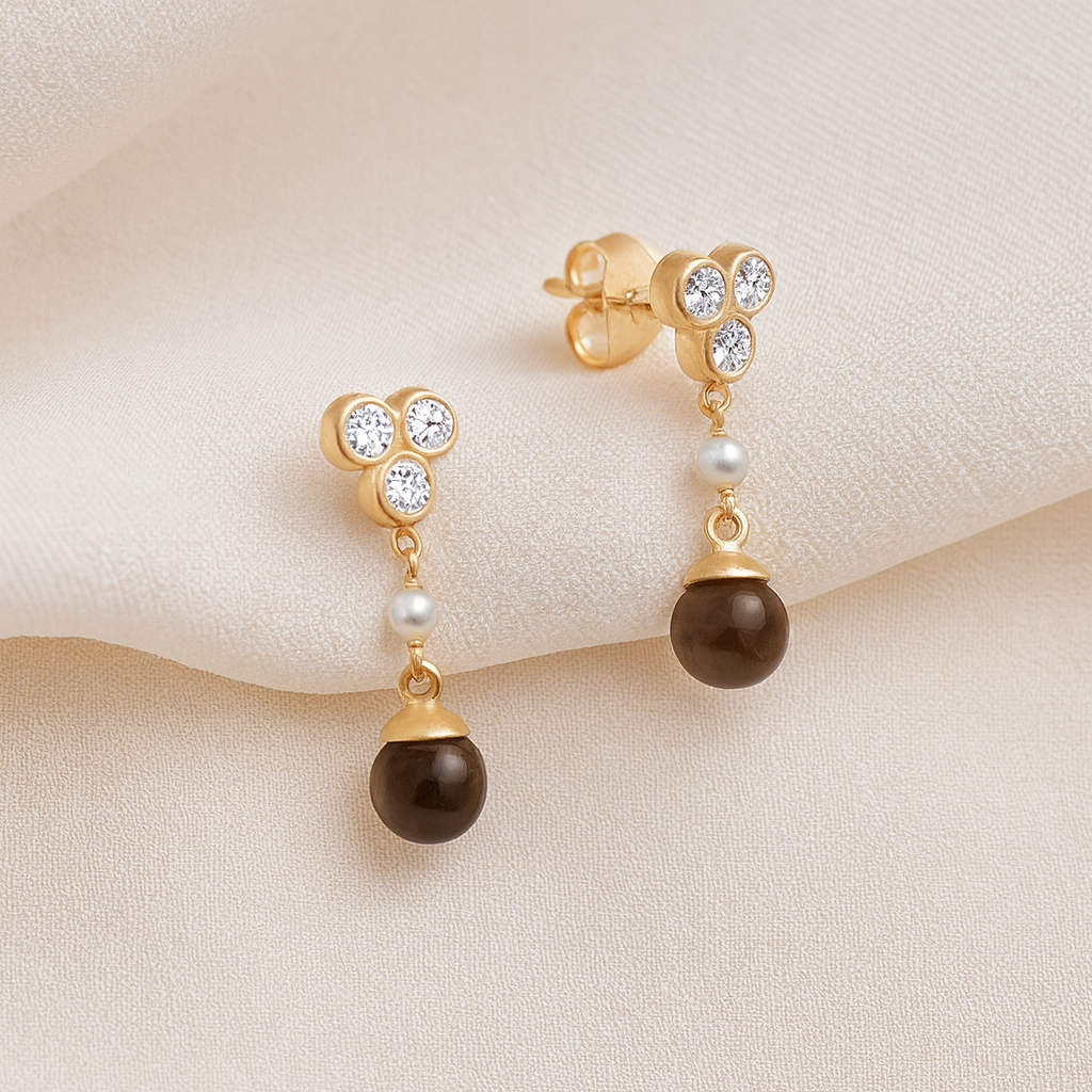 Designet som ørestikker sikrer, at øreringene sidder tæt og behageligt på øret, mens vedhænget giver bevægelse og liv til smykket. Den 14 karat forgyldte sølvbase giver en varm glød, der fremhæver både perler og røgkvarts, samtidig med at materialet sikrer holdbarhed og langvarig skønhed.