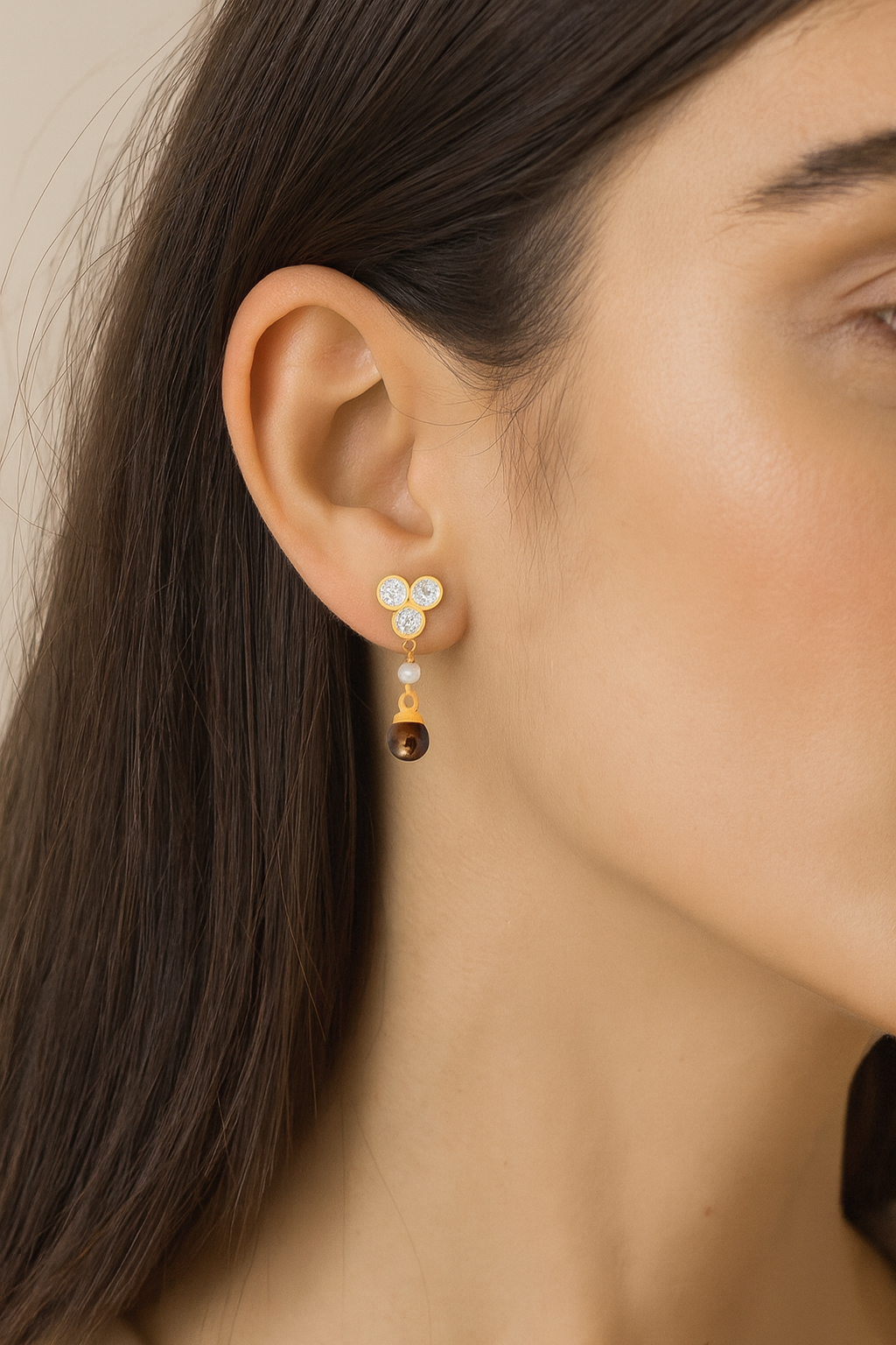 Disse elegante øreringe kombinerer klassisk skønhed med moderne finesse. Fremstillet i 14 karat forgyldt sterlingsølv, er de designet som ørestikker med delikate vedhæng, der prydes af hvide ferskvandsperler og varme, jordnære røgkvarts ædelsten. Kombinationen af den bløde glød fra perlerne og den dybe nuance fra røgkvartsen giver et sofistikeret, tidløst udtryk, som passer til både hverdag og særlige lejligheder.