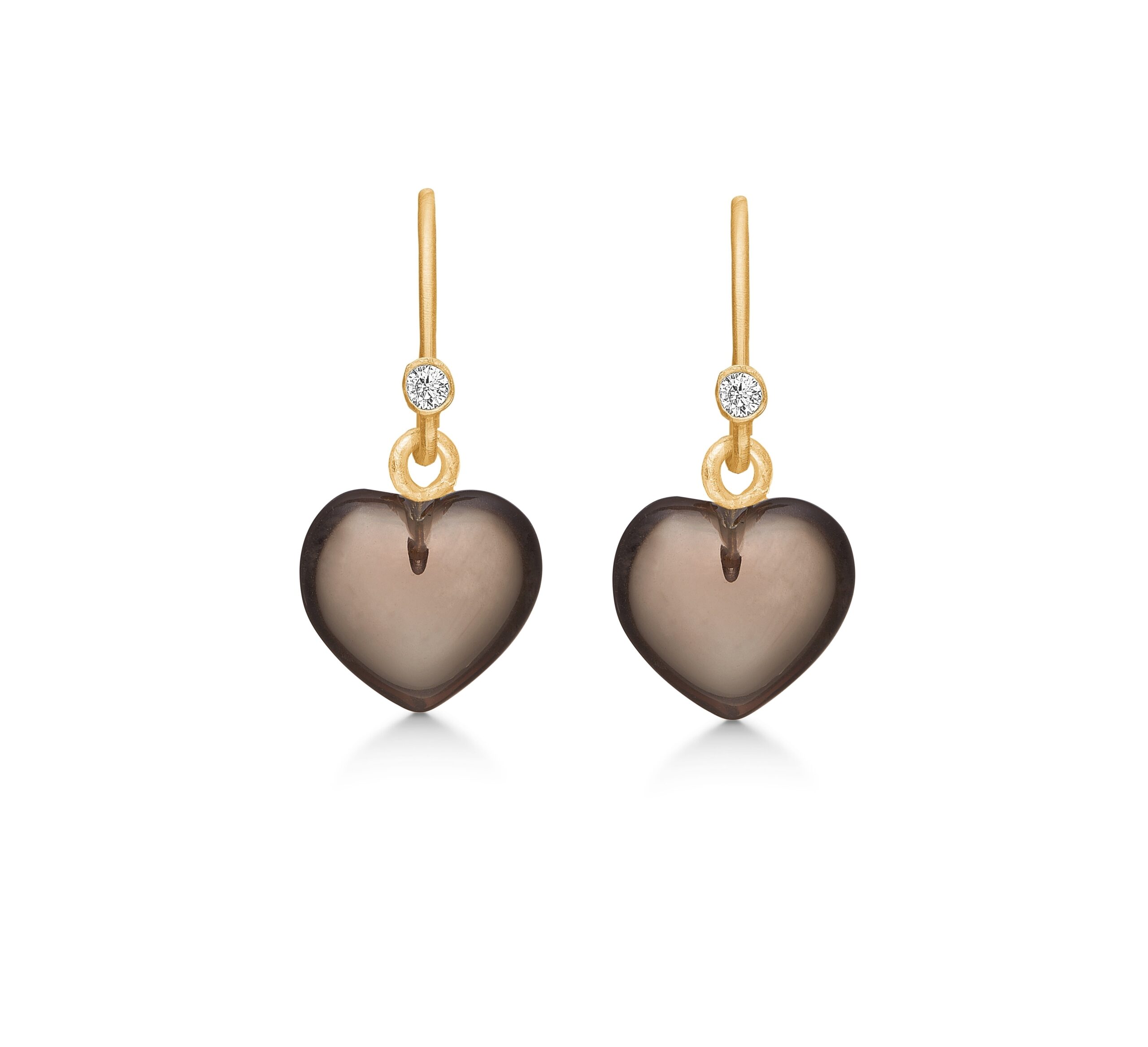Fineste øreringe i 14 karat forgyldt sterlingsølv med røgkvarts ædelsten slebet til smukke buttede hjerter i ædelsten.