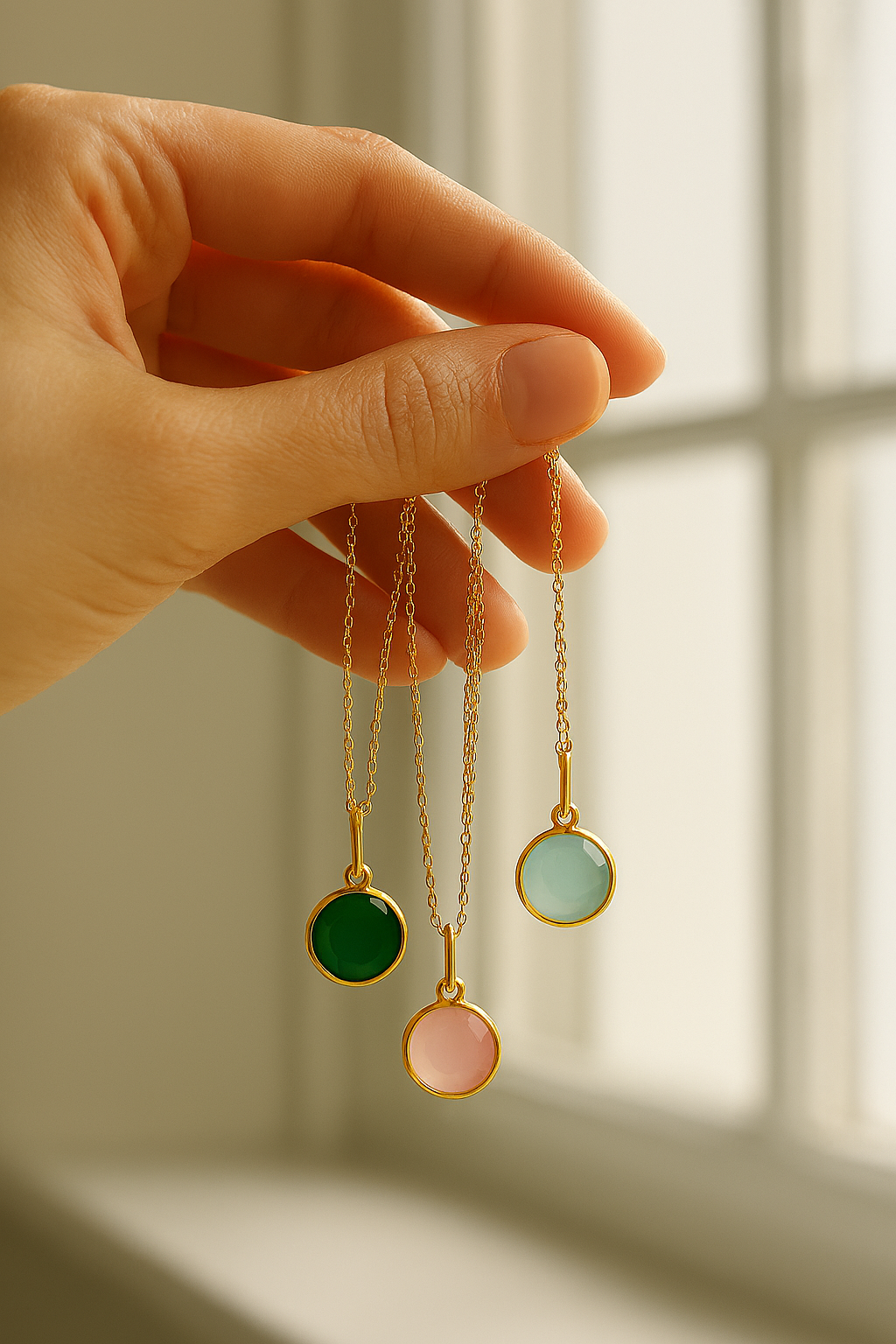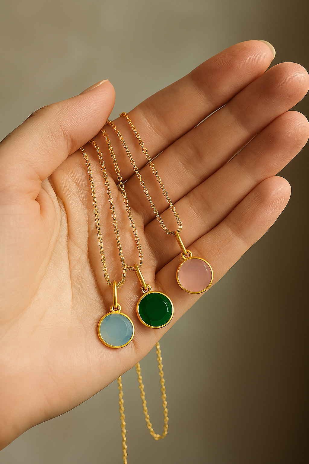I vores Cat kollektionen finder du 7 forskellige ædelsten: Fersken månesten, røgkvarts, aqua chalcedon, klar kvarts, grøn onyx, rosa chalcedon og klargrøn ametyst. Derudover har vi enkelte modeller med en blå chalcedon.