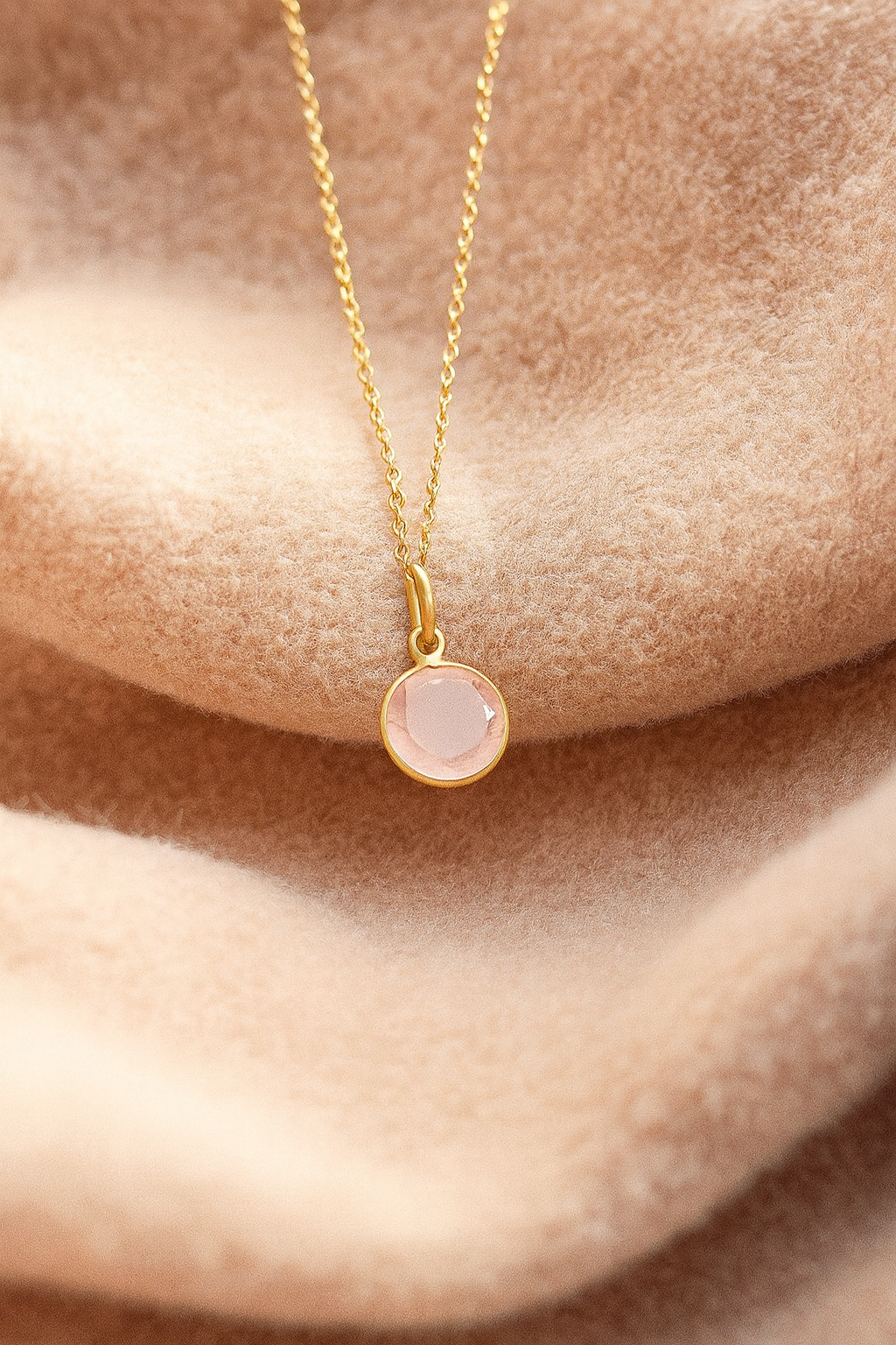 Produktbeskrivelse – Cat vedhæng med en facetslebet rosa chalcedon i 14 karat forgyldt sterlingsølv.