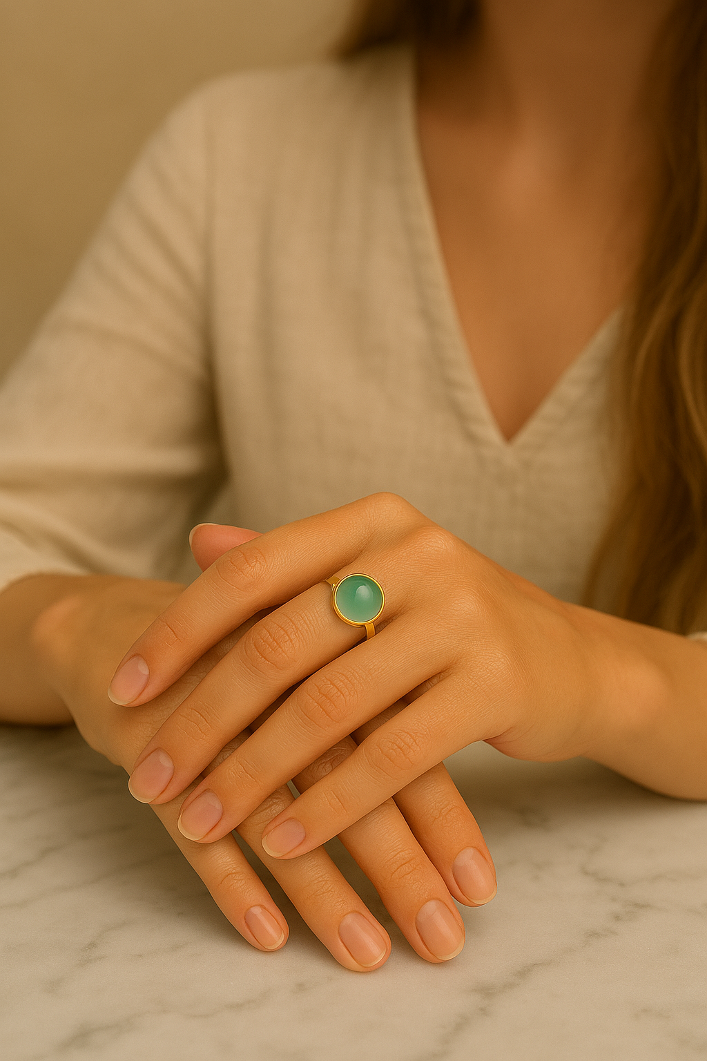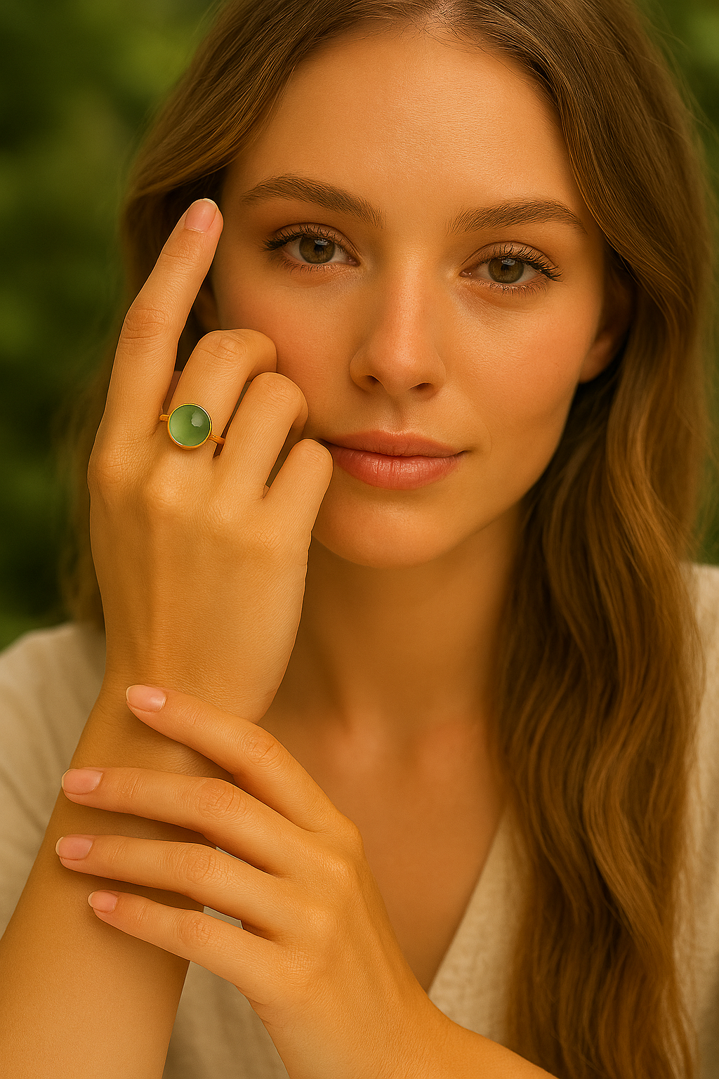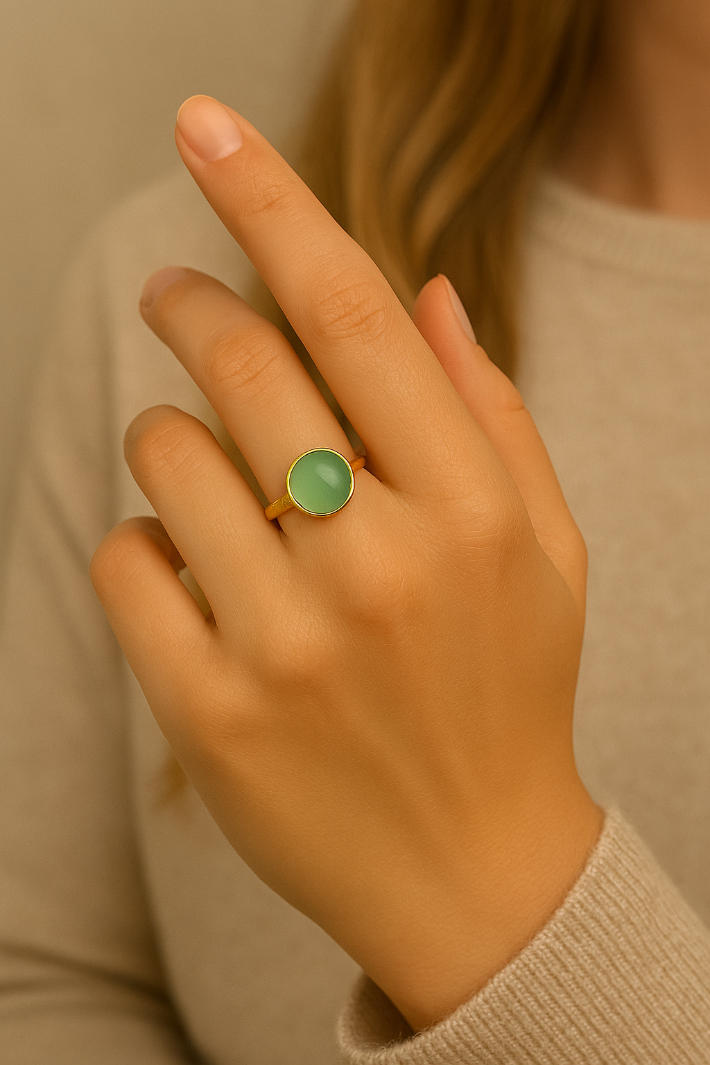 Ringen har den skønneste og mest friske farve, som passer til hændernes tone. Uanset om det er sommer eller vinter. Når hænderne bliver skønne sommerbrunebliver farven mere frisk og om vinteren nedtones den. Den agerer sammen med din farve. Årets farve 2025 der passer perfekt ind i din garderobe.