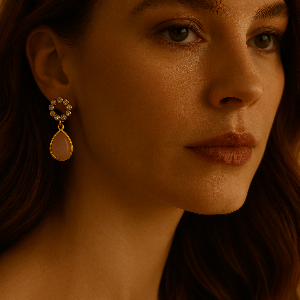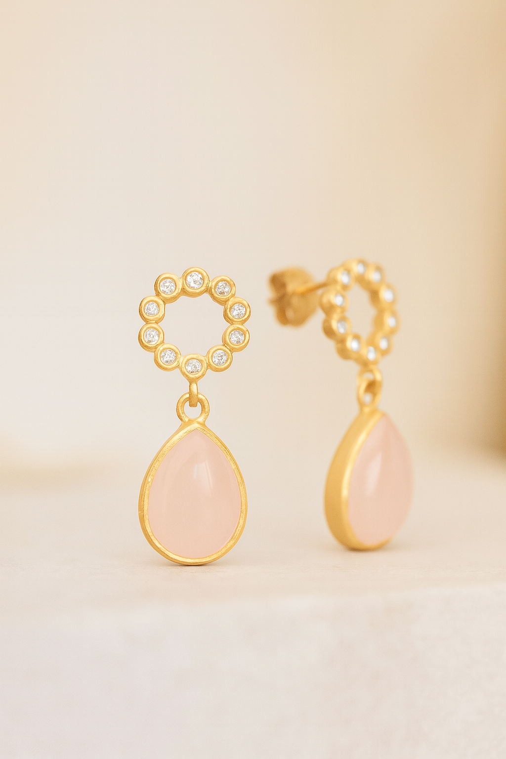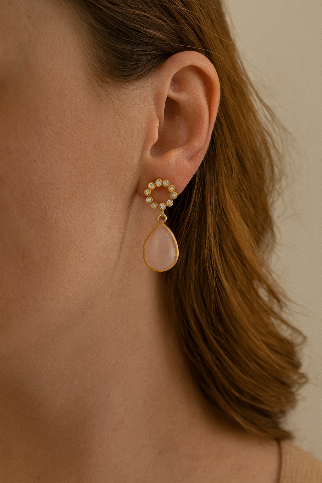 Cherie øreringe med rosa chalcedon og zirkonia i 14 karat forgyldt sterlingsølv er et personligt smykke, som er oplagt som morsdags gave, julegave og/eller fødselsdagsgave til en du holder af. Eller hvis du blot ønsker at forkæle dig selv. Cherie øreringen er også oplagt til studentergave, venindegave, årsdags gave og lignende anledninger. Øreringene kan let kombineres med Frk. Lisberg halskæder, armbånd og ringe, som alle også fås i 14 karat forgyldt sterlingsølv. På den måde får du hurtigt sikret en god gave, som kan bringe glæde, eller et flot sæt som du stolt kan vise frem. Øreringene kan bruges til både hverdag og fest, alt efter hvad man personligt ønsker. Øreringene har et undervurderet old money look og er perfekte til bruden, eller blyllupsgæsten – de vil funkle hele natten.