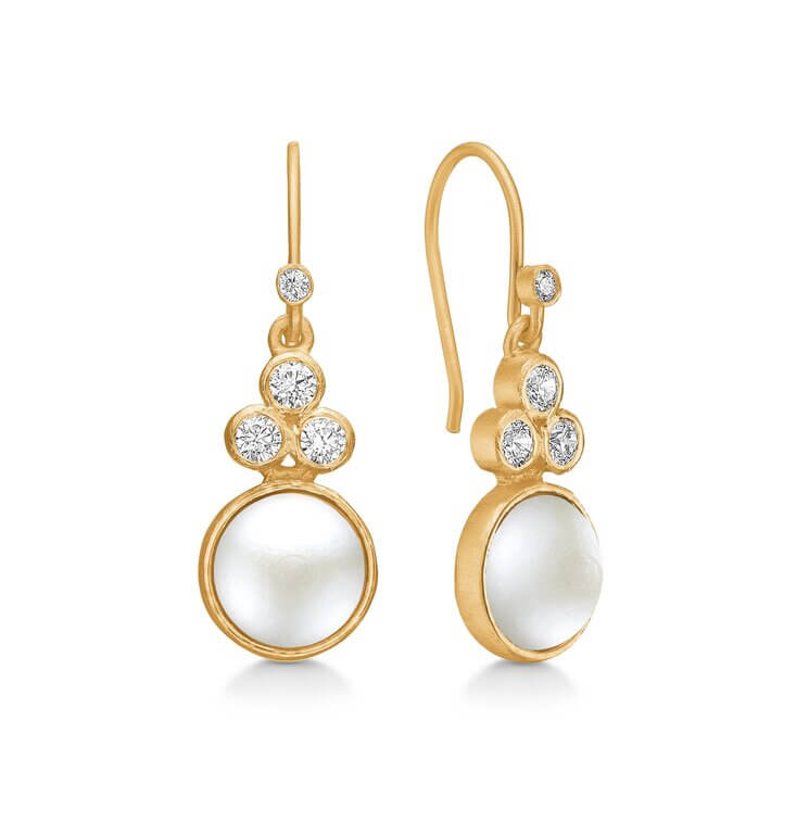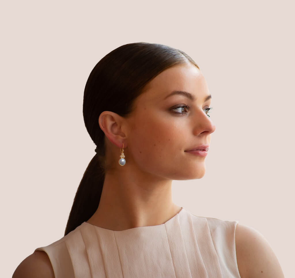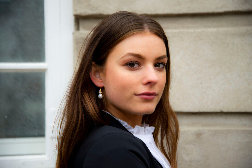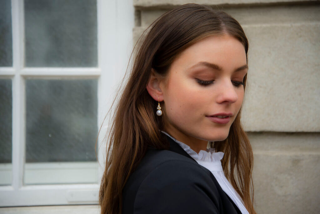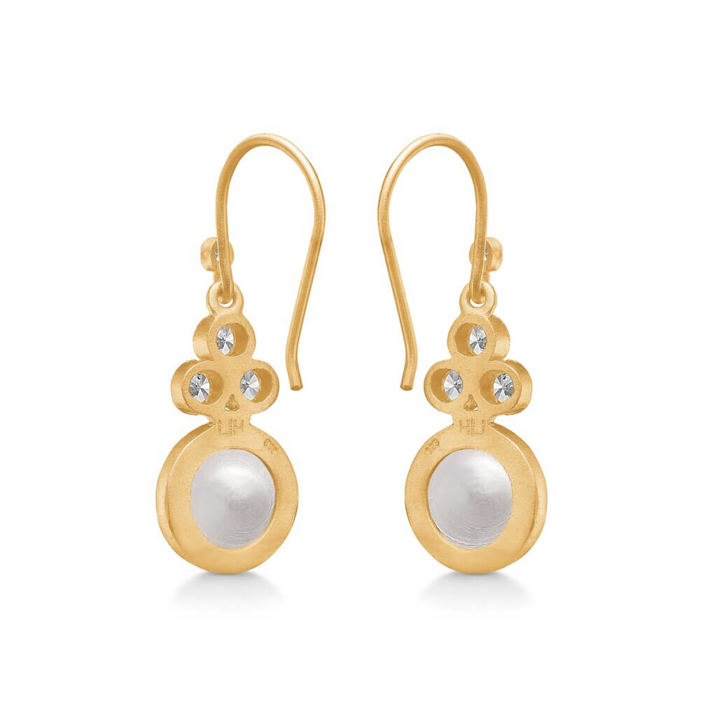 Clara øreringe med perle i 14 karat forgyldt sterlingsølv fra Frk. Lisberg. Øreringene kan let kombineres med fx armbånd, vedhæng og/eller ringe, hvis man ønsker det, men er også rigtig fin at bære alene.