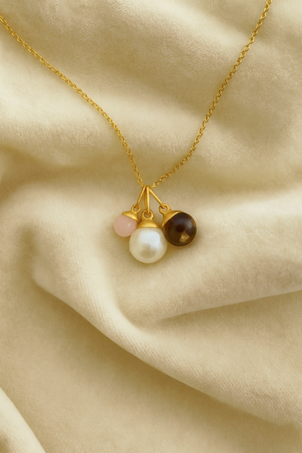 Du kan vælge mellem 8 forskellige ædelsten – fersken månesten, aqua chalcedon, røgkvarts, klar kvarts, grøn onyx, rosa chalcedon, grøn ametyst og en ferskvandsperle. Ædelstenen er slebet runde og har alle en utrolig flot changering af farver.