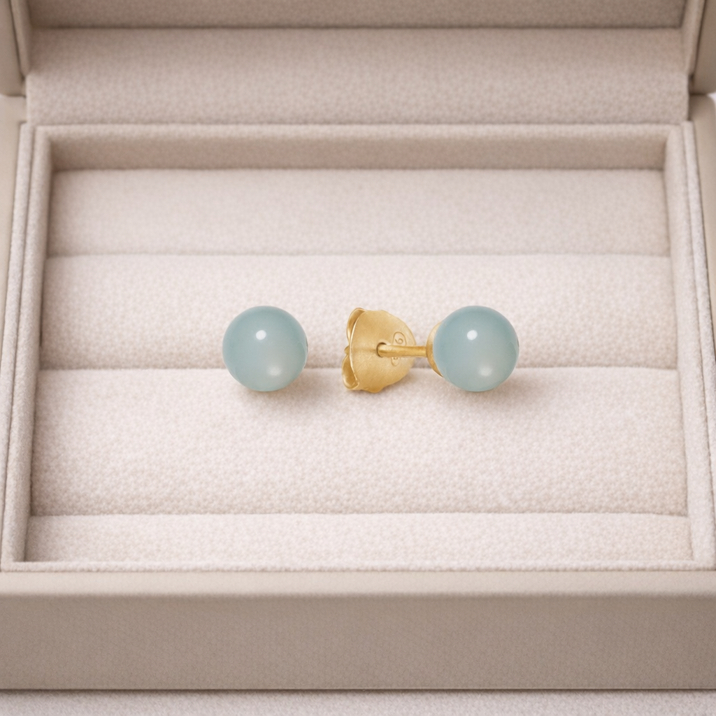 Columbine ørestik aqua chalcedon i 14 karat forgyldt sterlingsølv fra Lisberg Jewellery. Ørestikkerne kan bæres som sæt sammen med Lisberg Jewellery´s mange message halskæder, armbånd og ringe, hvis man ønsker det, men kan sagtens bæres alene. Ørestikkerne er formet som en kugle, og er dermed meget enkel, og passer til alt. Columbine ørestikkerne kommer i syv forskellige farver ædelsten.