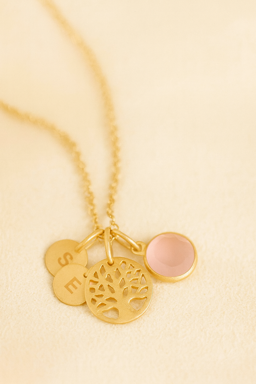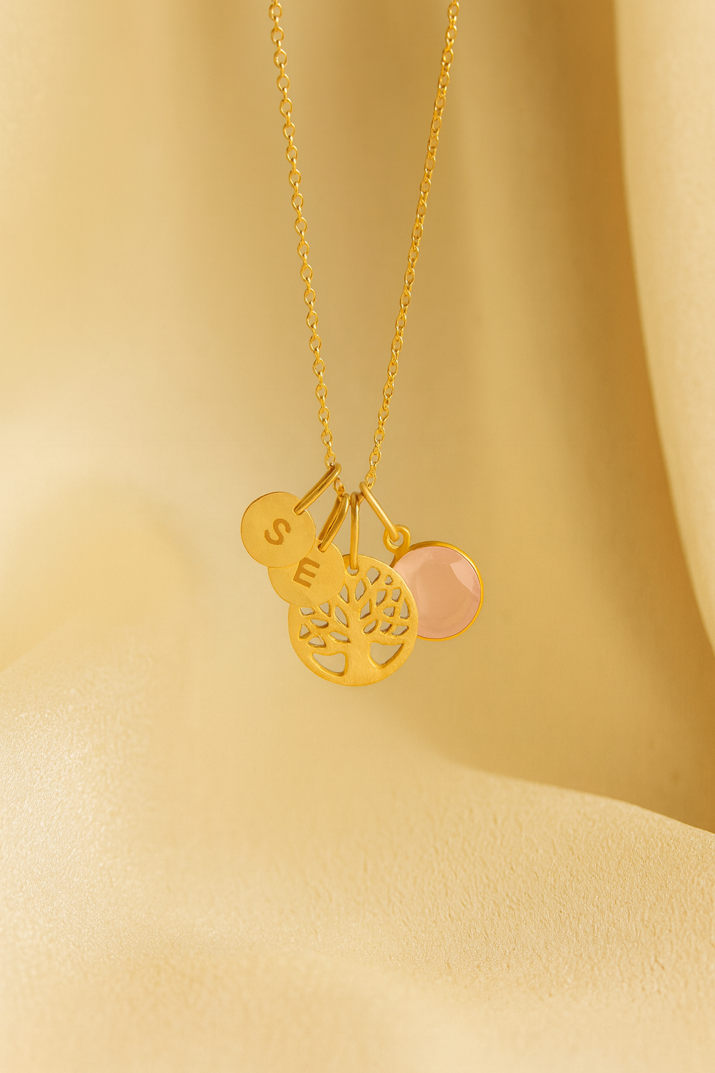 Personlig halskæde med livets træ, bogstaver og ædelsten – Frk Lisberg
