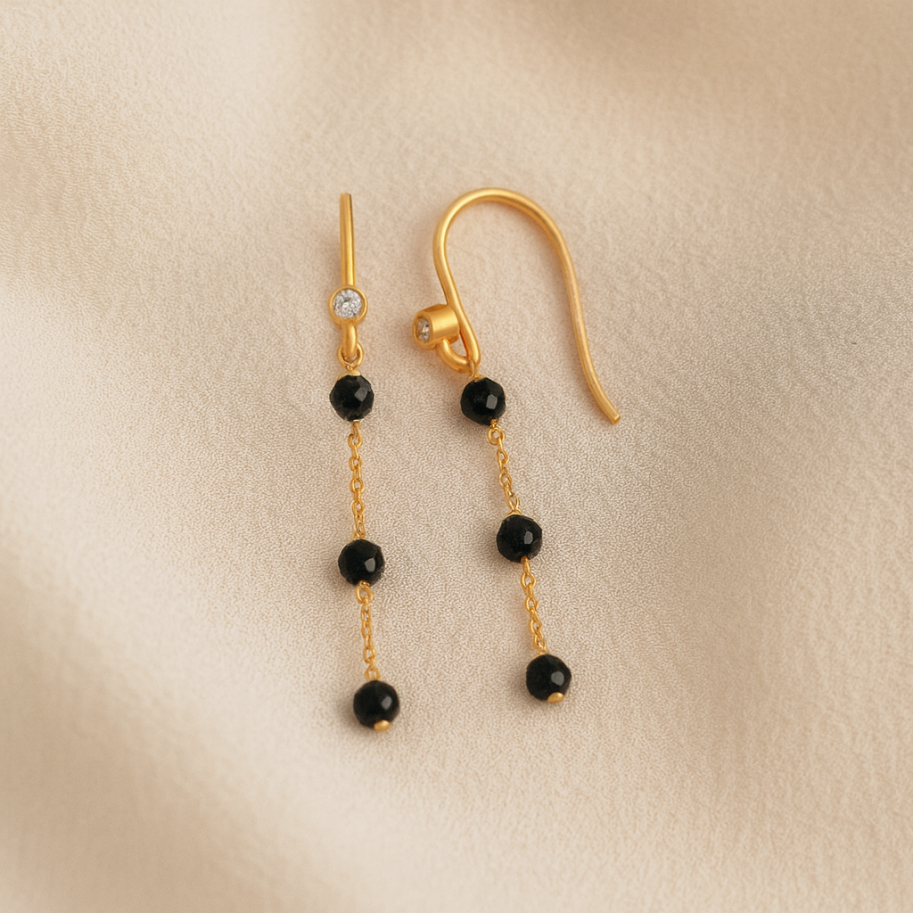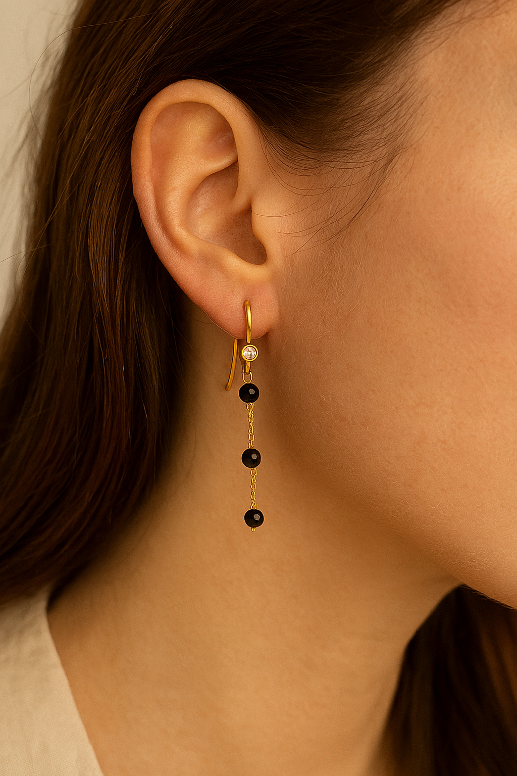 Øreringene har en længde på ca. 4 cm, hvilket giver et let og yndefuldt fald ✨. De sorte onyx-sten tilfører smykket kontrast og dybde, og deres facetslibning fanger lyset på en subtil, men smuk måde, når du bærer dem. Designet er balanceret og feminint – elegant uden at være prangende.