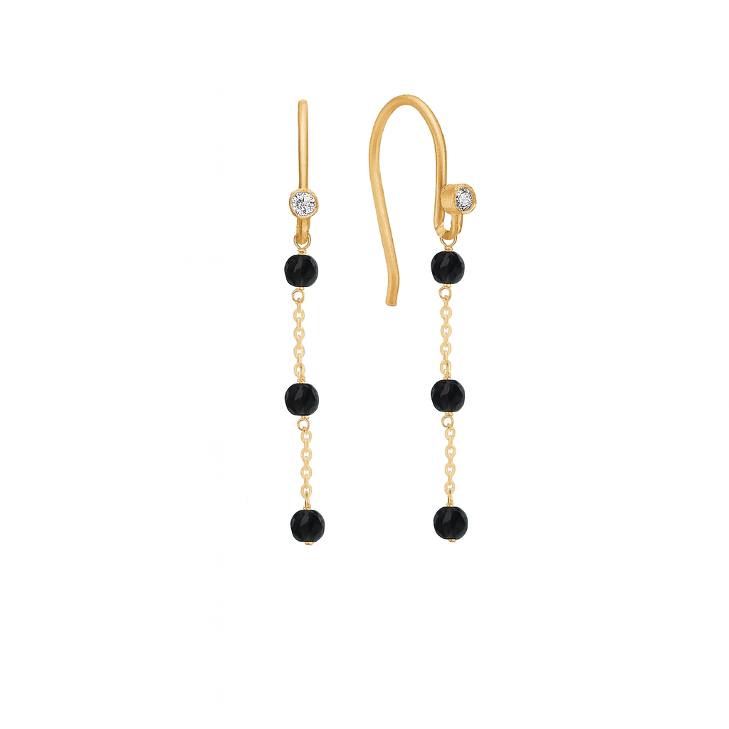 Disse smukke øreringe er udført i 14 karat forgyldt sterlingsølv og prydet med små, fine facetslebne sorte onyx-sten 🖤. Kombinationen af det varme, forgyldte sølv og onyxens dybe, sorte nuance skaber et klassisk og elegant udtryk, der passer perfekt ind i Frk Lisbergs tidløse univers.
