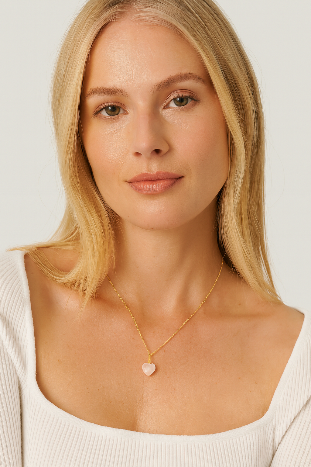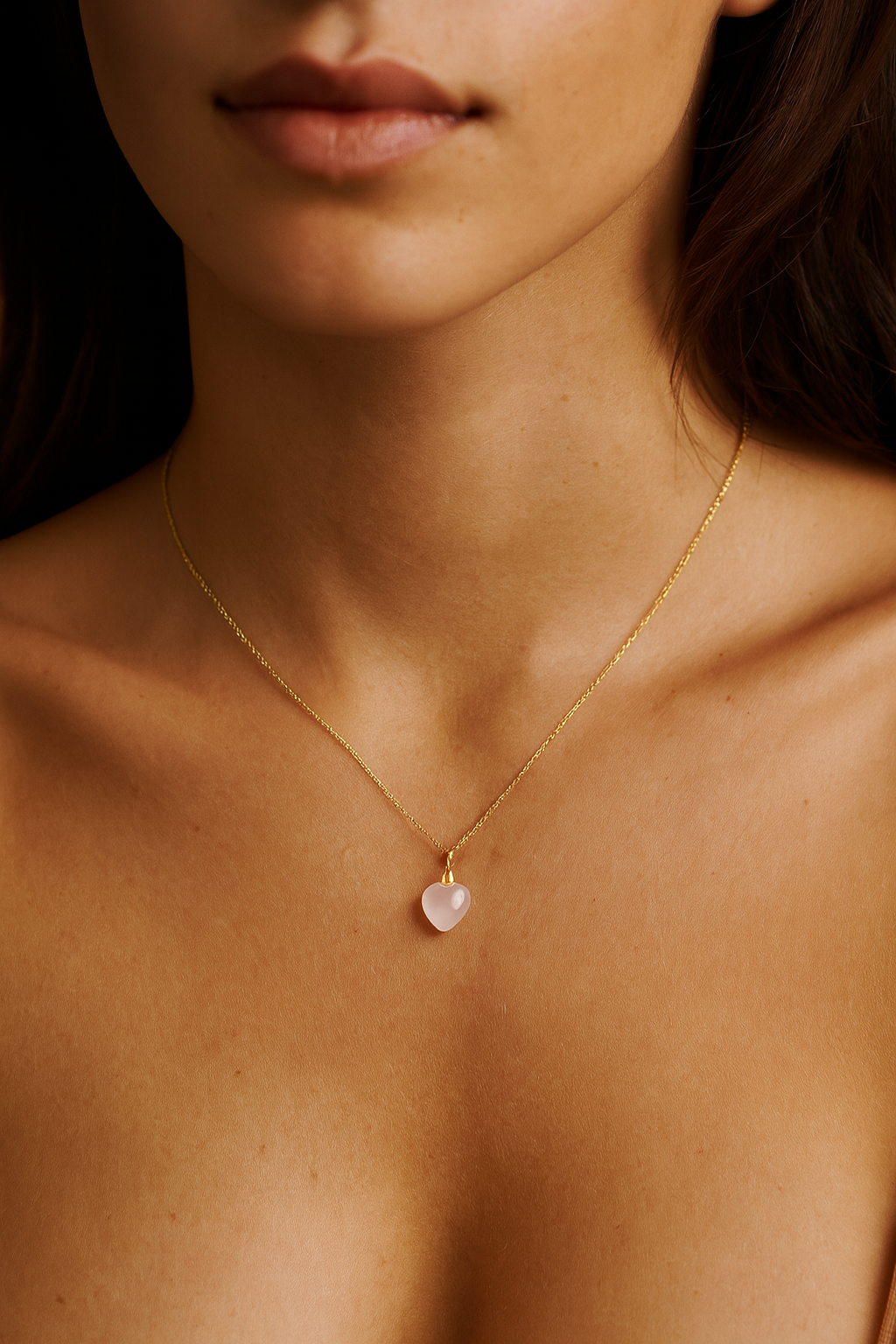 Stone heart vedhæng rosa chalcedon i 14 karat forgyldt sterlingsølv. Stone heart vedhængene findes i otte forskellige farver af sten.