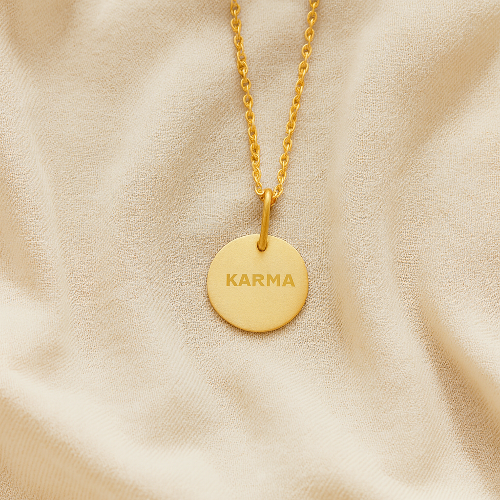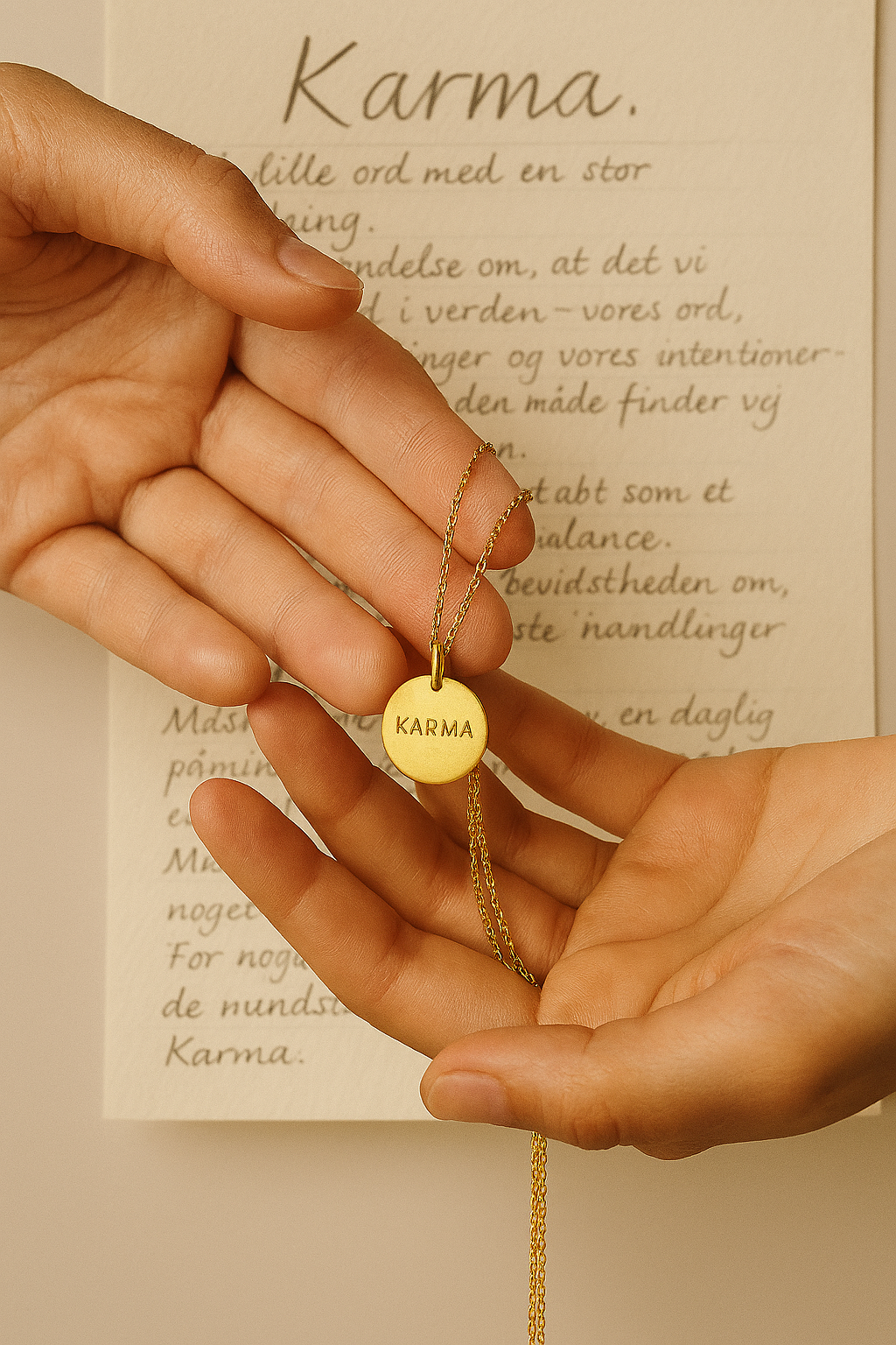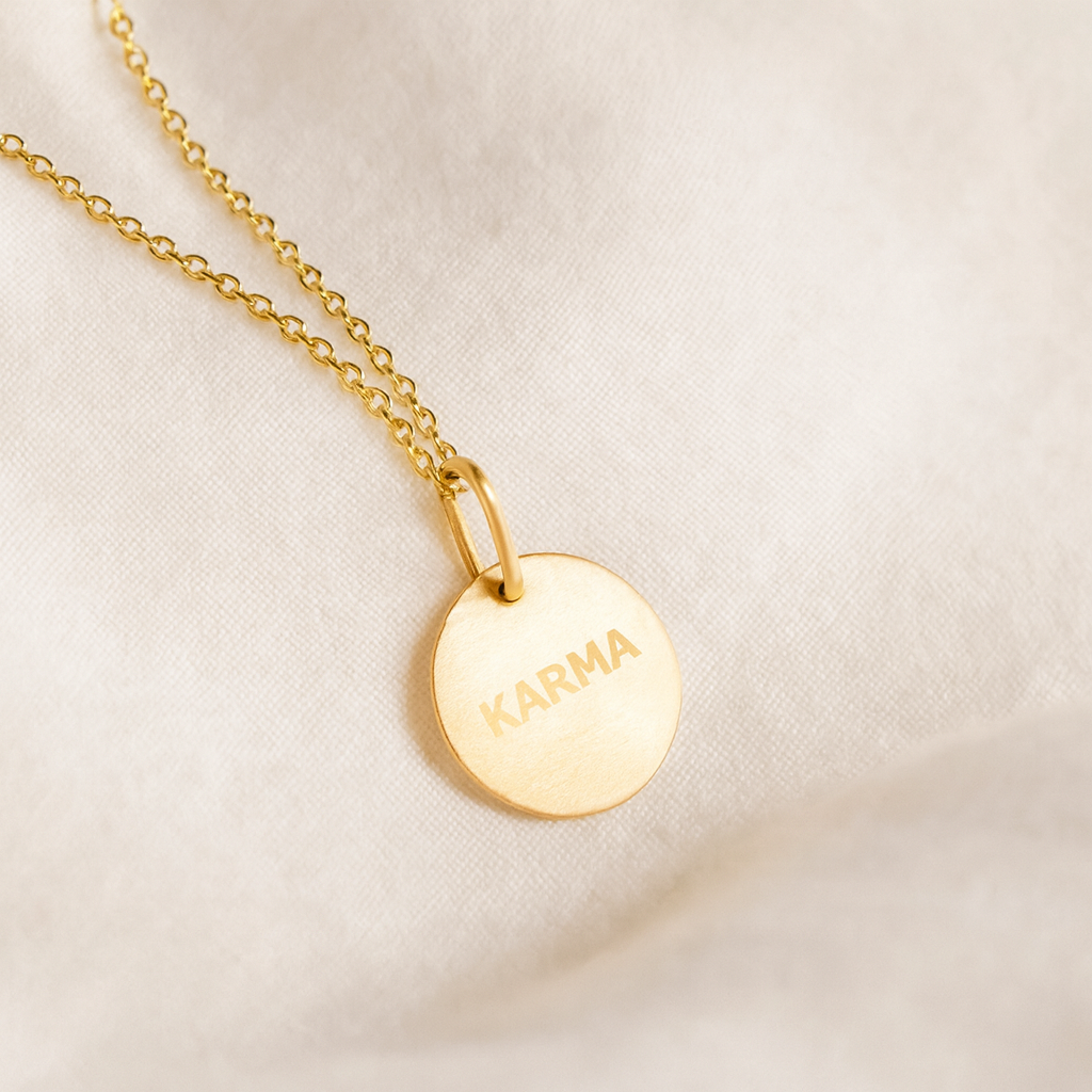 Vedhæng med teksten ‘KARMA’ i 14 karat forgyldt sterlingsølv fra Frk. Lisberg. Vedhænget kan sættes på både halskæder og armbånd alt efter ønske. Vedhænget kan let kombineres med andre af Frk. Lisberg’s mange message vedhæng, hvis man ønsker det, men er også rigtig fin at bære alene.