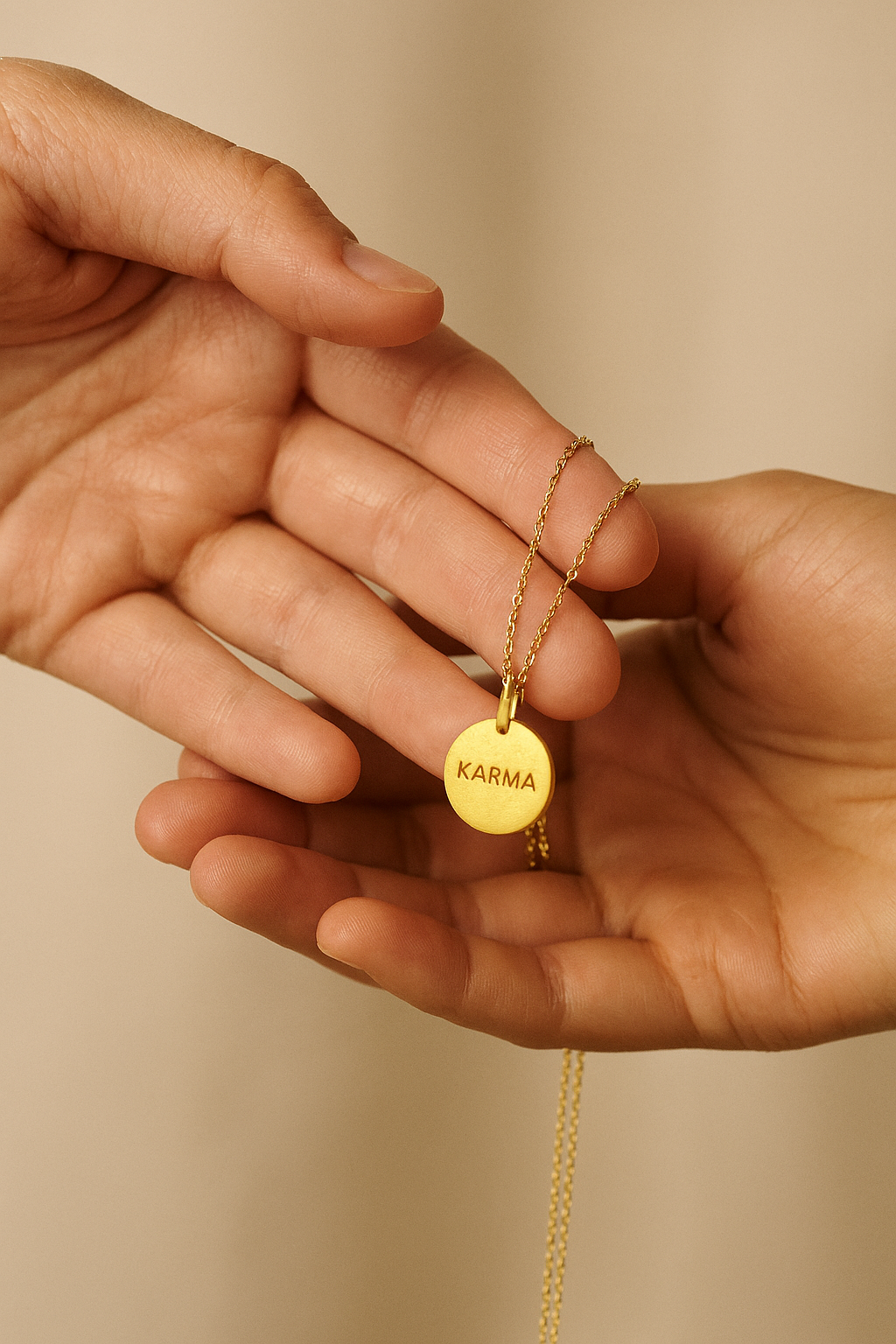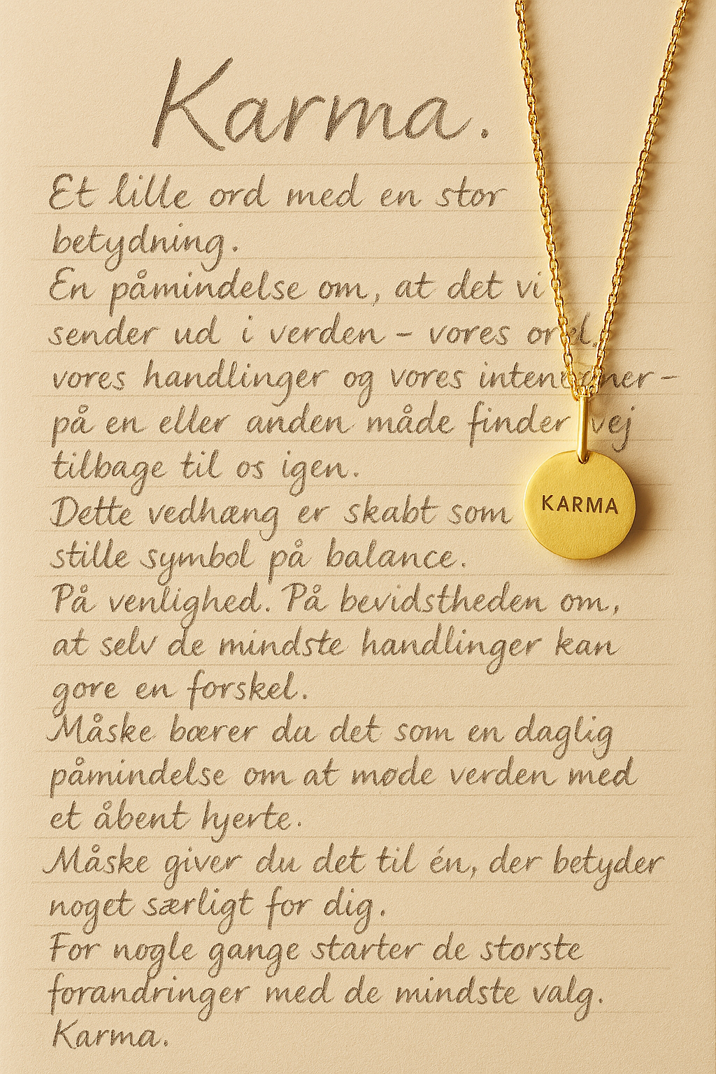 Vedhæng med teksten ‘KARMA’ i 14 karat forgyldt sterlingsølv er et personligt smykke, som er oplagt som julegave og/eller fødselsdagsgave til en du holder af. Eller hvis du blot ønsker at forkæle dig selv. Vedhænget kan let kombineres med Frk. Lisberg’s mange message vedhæng, som alle også fås i 14 karat forgyldt sterlingsølv. På den måde får du hurtigt sikret en god gave, som kan bringe glæde, eller et flot sæt som du stolt kan vise frem. Vedhænget kan kombineres og bruges til både hverdag og fest, alt efter hvad man ønsker.