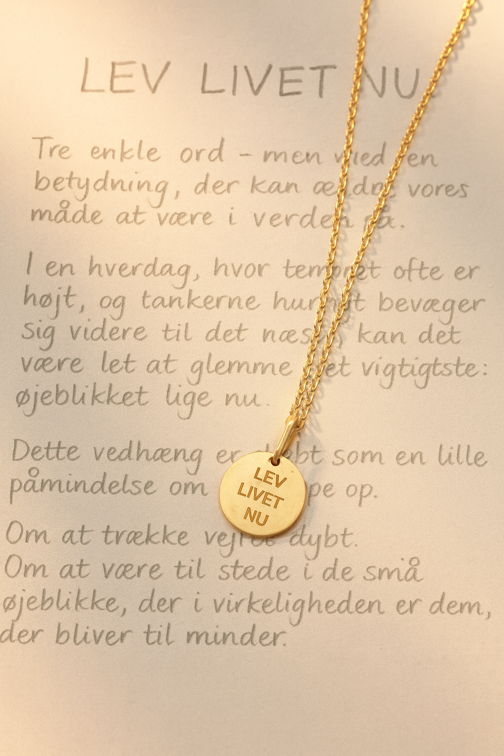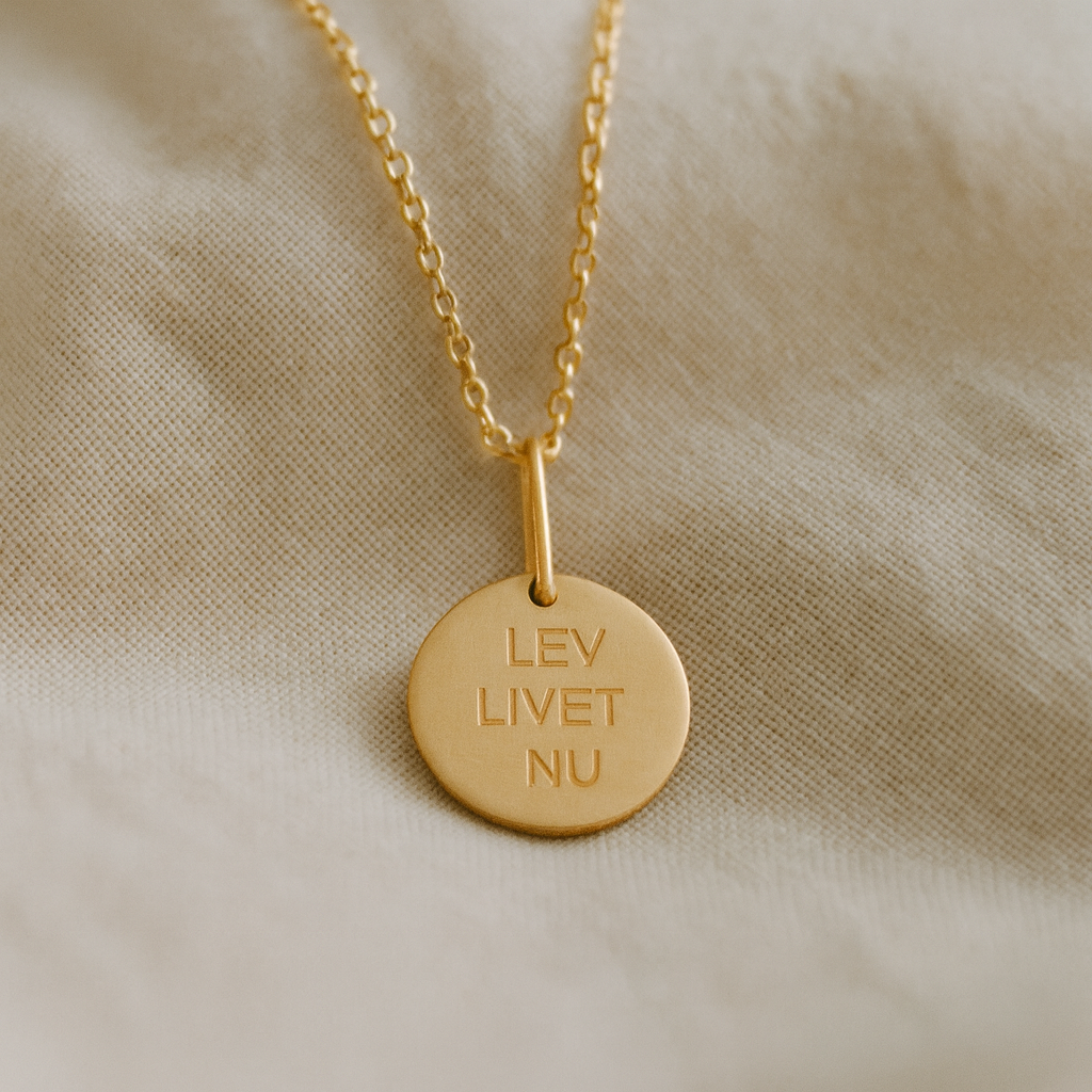 Vedhæng med teksten ‘LEV LIVET NU’ i 14 karat forgyldt sterlingsølv