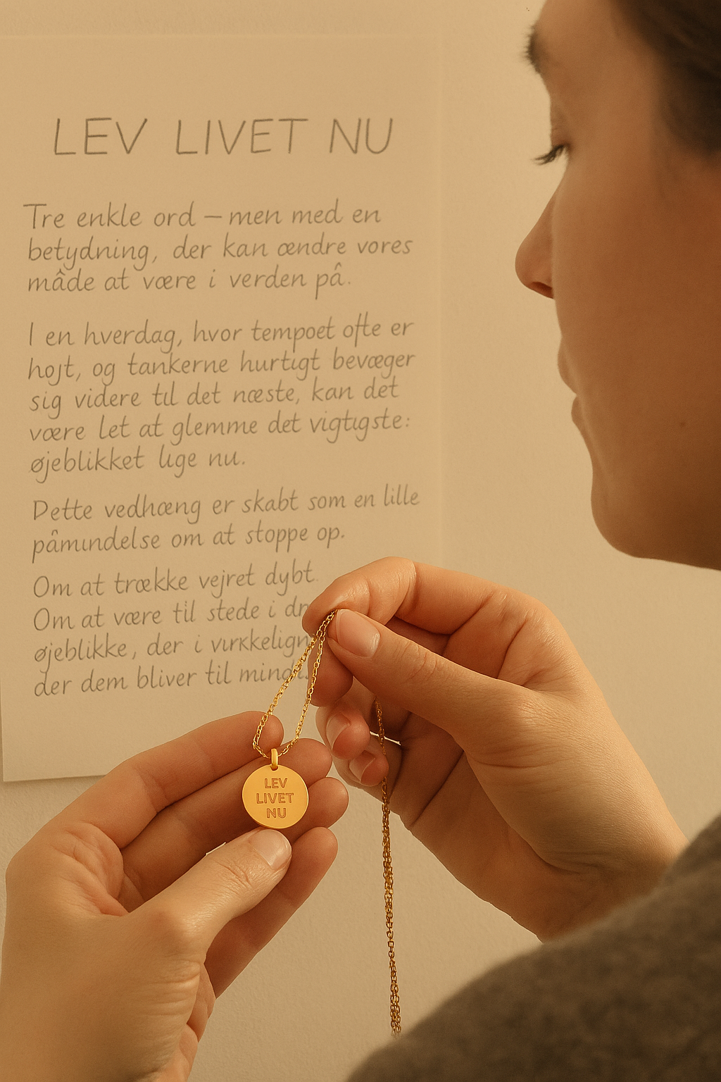 Vedhæng med teksten ‘LEV LIVET NU’ i 14 karat forgyldt sterlingsølv fra Frk. Lisberg. Vedhænget kan sættes på både halskæder og armbånd alt efter ønske. Vedhænget kan let kombineres med andre af Frk. Lisberg’s mange message vedhæng, hvis man ønsker det, men er også rigtig fin at bære alene.