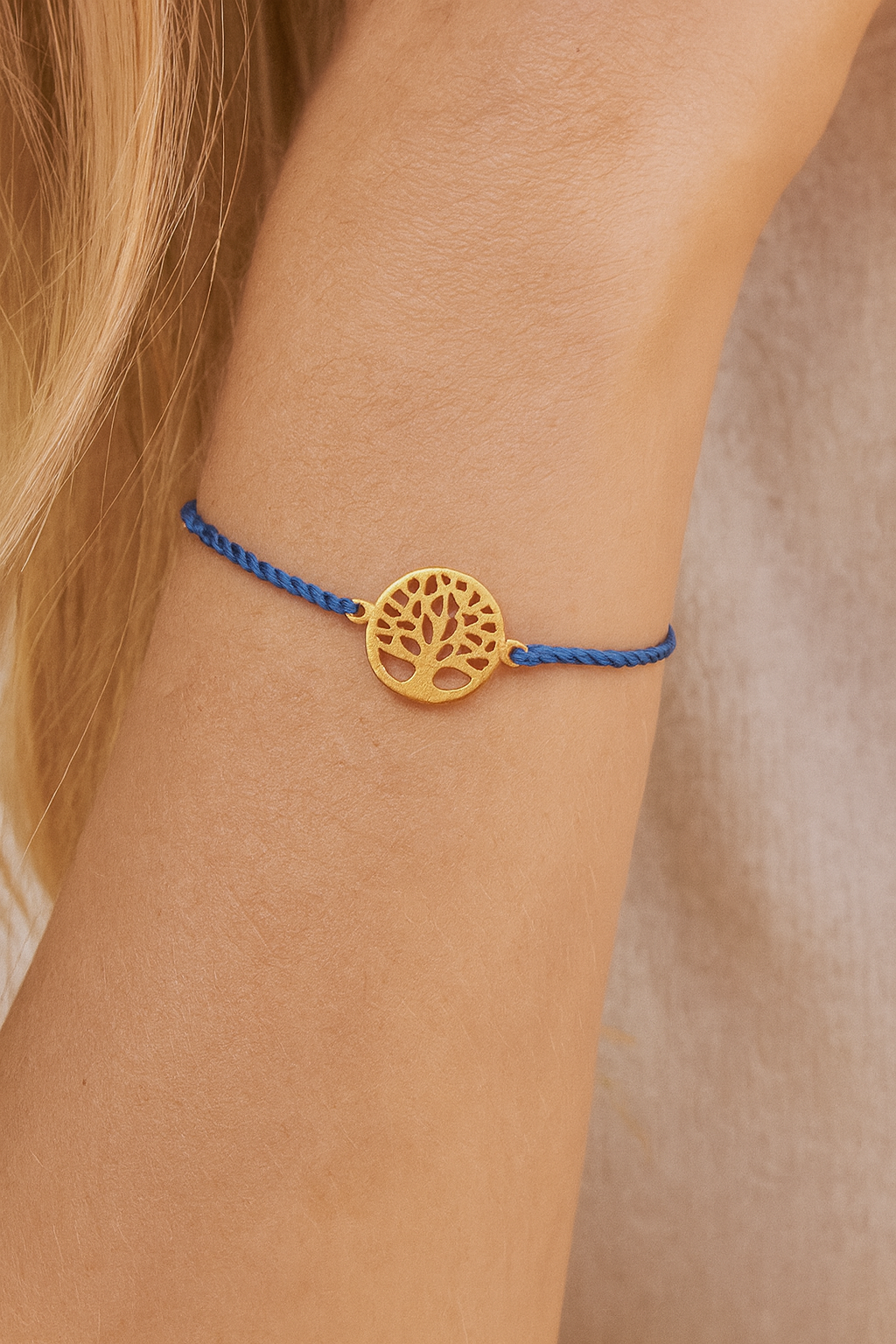Justerbart armbånd i blå silkesnor med livets træ vedhæng i 14 karat forgyldt sterlingsølv fra Frk. Lisberg. Armbåndet kan justeres op til max 24 cm, og så lille som man ønsker. Da armbåndet er af silkesnor, er det behageligt at bære, og kan let kombineres med fx andre armbånd eller smykker, hvis man ønsker det, men er også rigtig fint at bære alene. Armbåndet findes i en lang række forskellige farver.