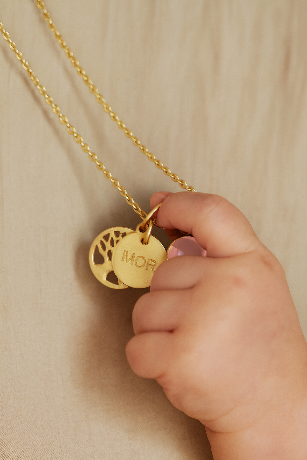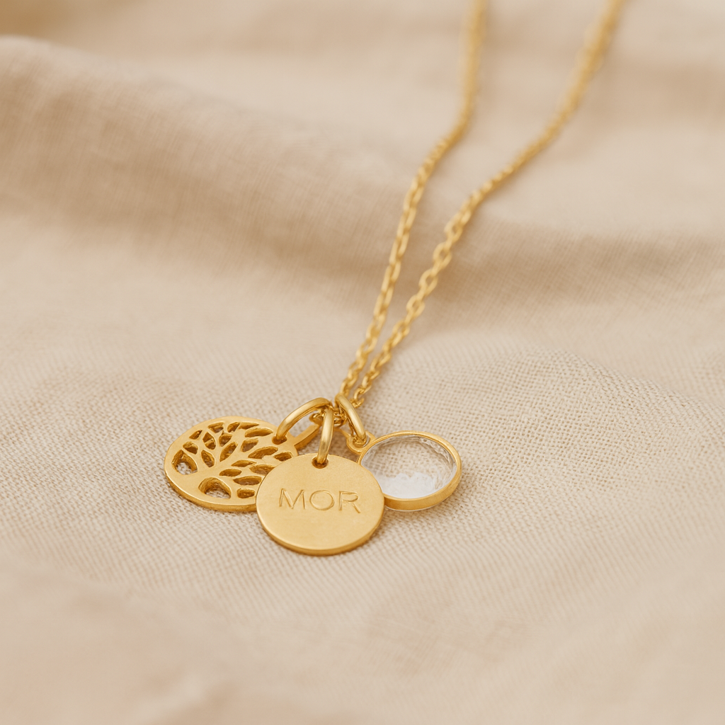 Livets Træ repræsenterer de stærke rødder, hun har plantet, og de grene, der vokser – hendes børn og børnebørn. “Mor”-vedhænget minder hende om den kærlighed, der binder jer sammen, uanset hvor livet fører jer hen.