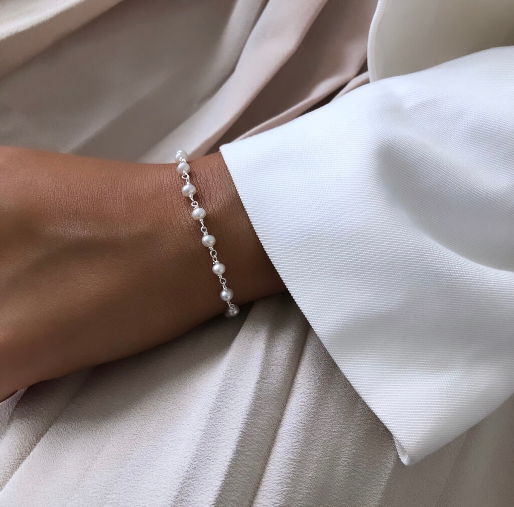 Nora multi armbånd med små ferskperler i sterlingsølv fra Frk. Lisberg. Armbåndet med små ferskvandsperle kan kombineres med andre smykker fra Nora kollektionen.