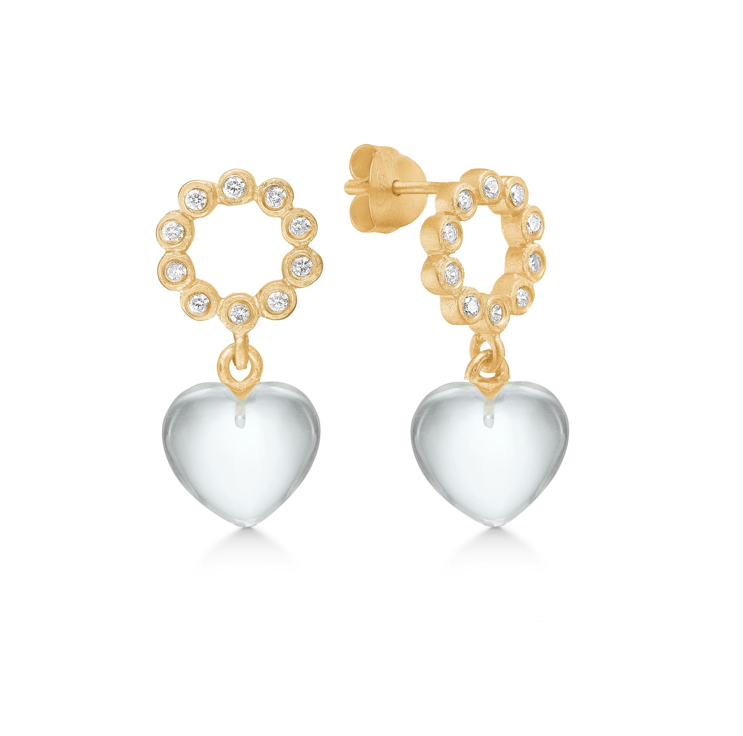 Fineste øreringe i 14 karat forgyldt sterlingsølv med klare kvarts sten slebet til smukke buttede hjerter i ædelsten.