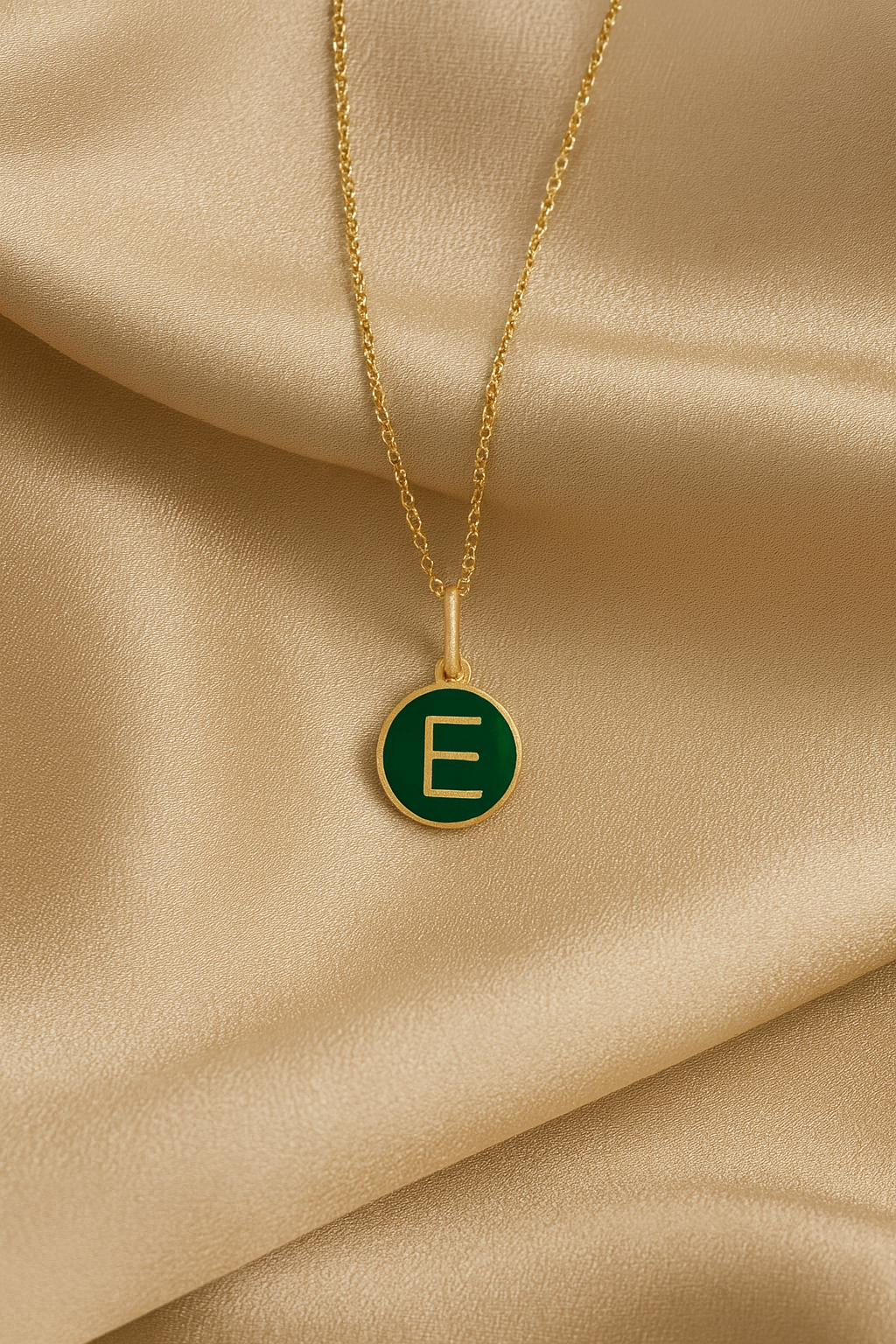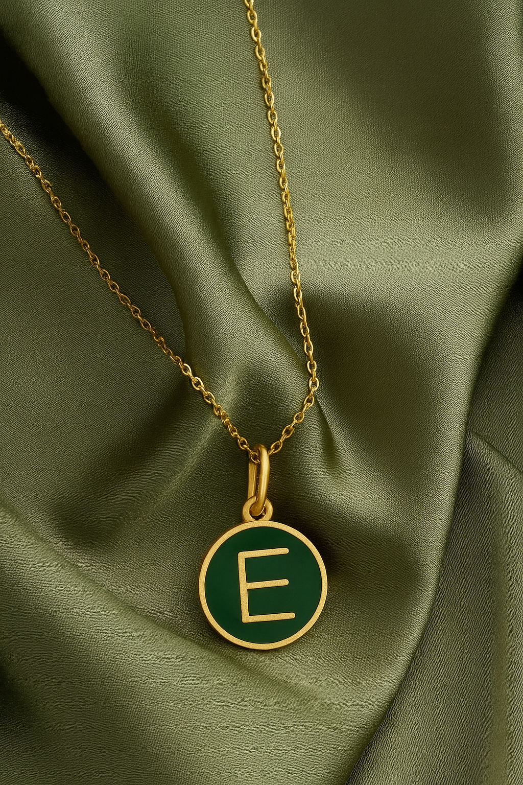 Vi elsker at mixe materialer og kombinationen af enamel og guld og sølv skaber skønne kontraster. Det fantastiske med enamel er de mange skønne farver vi kan lege med i vores designs, og det grafiske i vedhænget træder tydeligt frem med farven. Grøn og guld skaber for os et eksklusivt look og bogstavet træder tydeligt frem i den mørke grønne farve. Et uniks og staærkt vedhæng der kan kombineres med andre farver og dermed skabes et personligt udtryk. Bogstavet kan symbolisere dig selv eller en du har kær.
