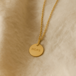 Dette vedhæng er udført i 14 karat forgyldt sterlingsølv og har en varm, gylden glød, som giver smykket et blødt og tidløst udtryk. Den runde form og den enkle gravering skaber et harmonisk design, hvor ordene får lov at stå klart og roligt. Med en diameter på ca. 1,3 cm har vedhænget en fin størrelse, der gør det let at bære hver dag – tæt på hjertet, hvor intentionerne bor.