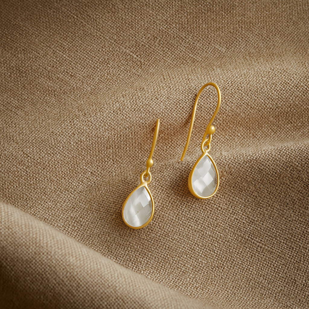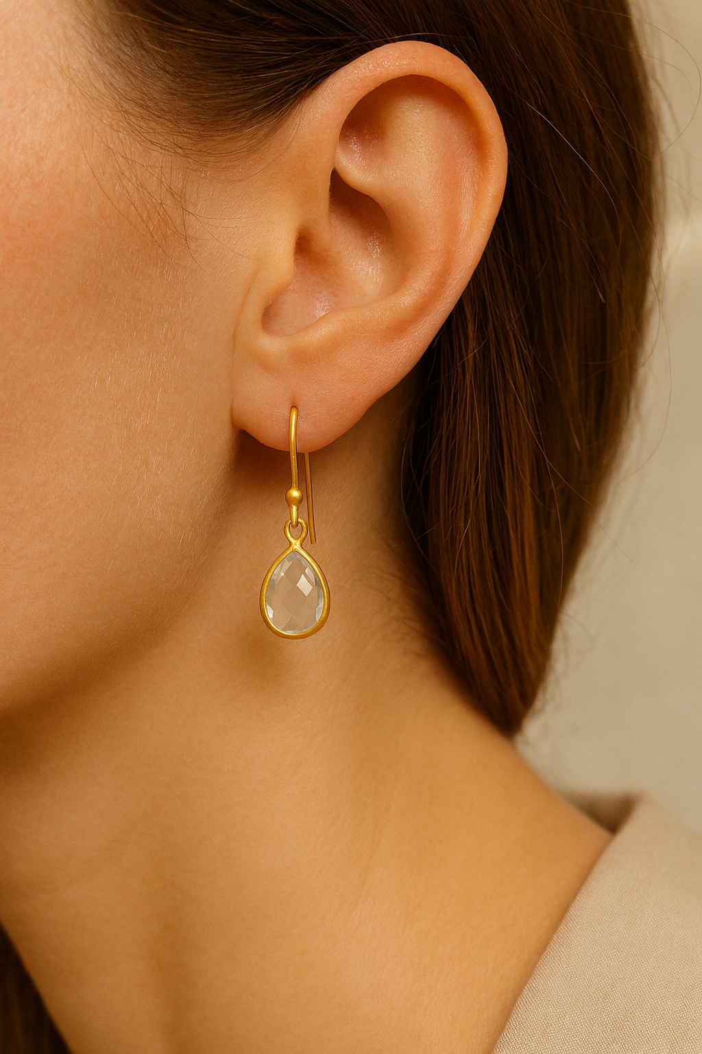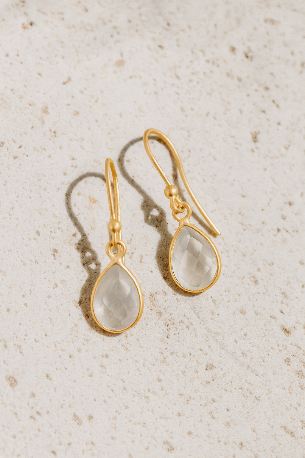 Sophie øreringe klar kvarts i 14 karat forgyldt sterlingsølv fra Frk. Lisberg. Øreringene kan bæres som sæt sammen med Frk. Lisberg’s mange message halskæder, armbånd og ringe, hvis man ønsker det, men kan sagtens bæres alene. Øreringen er formet som en cirkel, og er dermed meget enkel, og passer til alt.