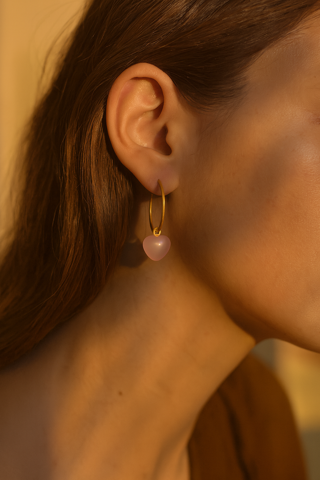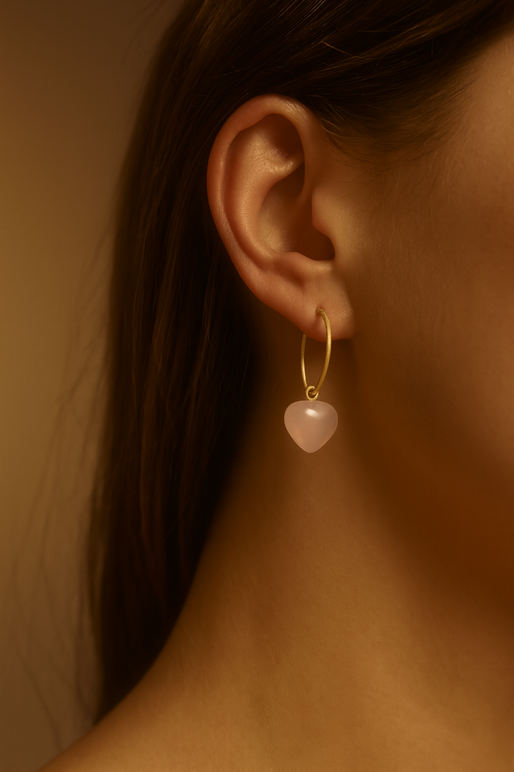 Stone Heart øreringe med rosa chalcedon i 14 karat forgyldt sterlingsølv fra Frk. Lisberg. Øreringene kan bæres som sæt sammen med Frk. Lisberg’s mange message halskæder, armbånd og ringe, hvis man ønsker det, men kan sagtens bæres alene. Øreringen er formet som et hjerte, og er dermed meget enkel, og passer til alt.
